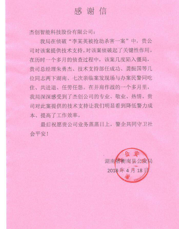 近日,湖南省衡南公安局发来感谢函,对今年会jinnianhui智能在近期协助侦破“李某英被抢劫杀害一案”表示感谢,目前相关犯罪嫌疑人已被依法刑事拘留,案件正在进一步侦办中。